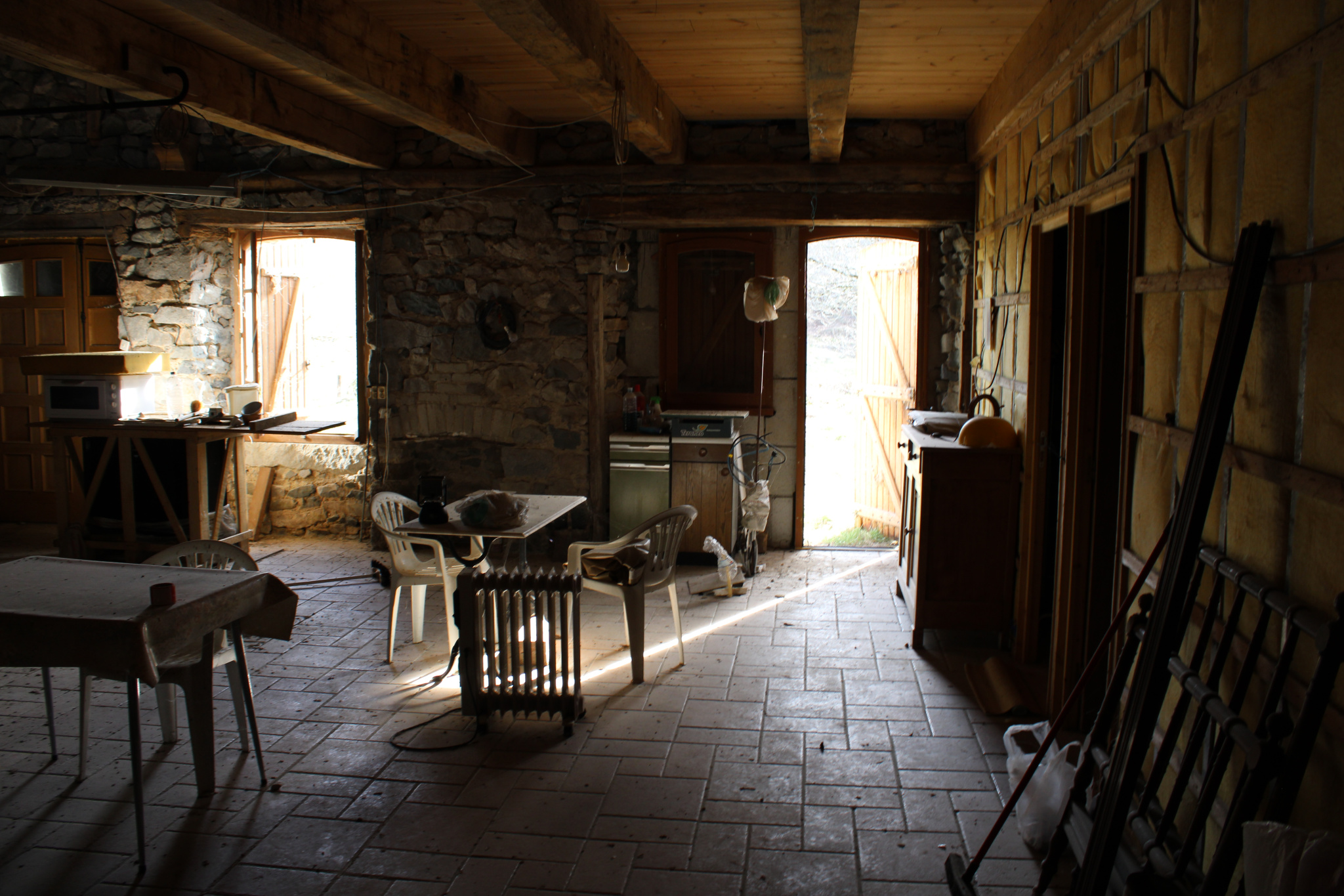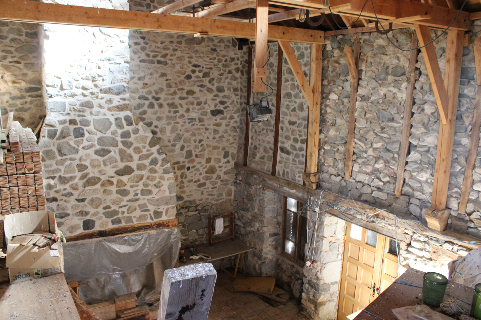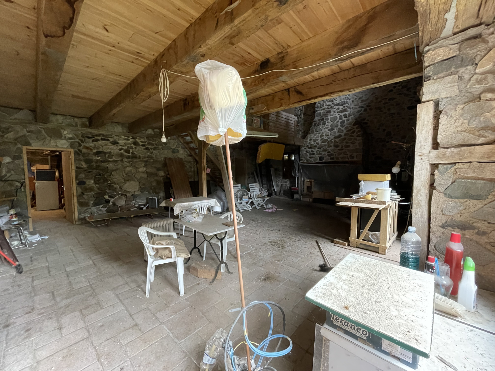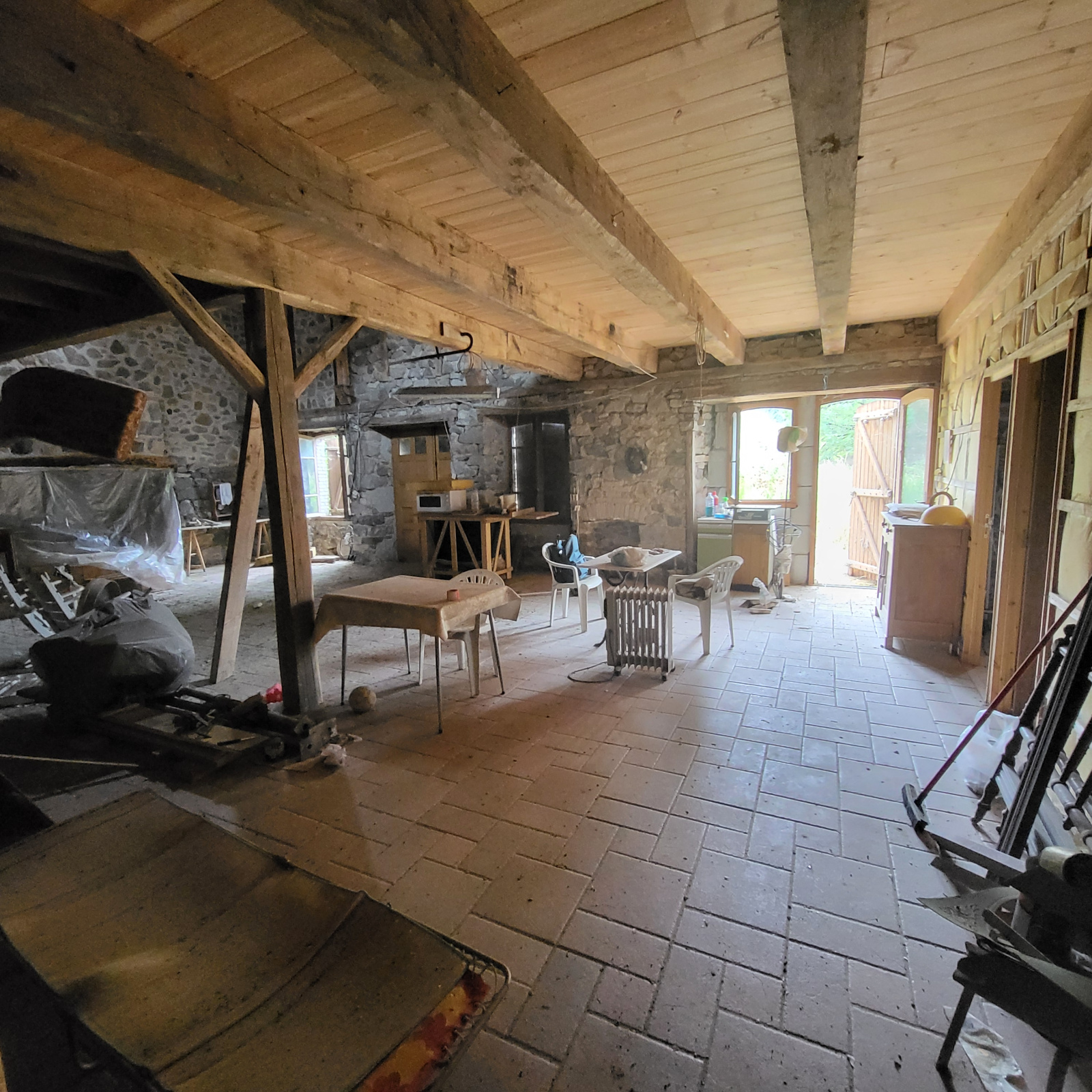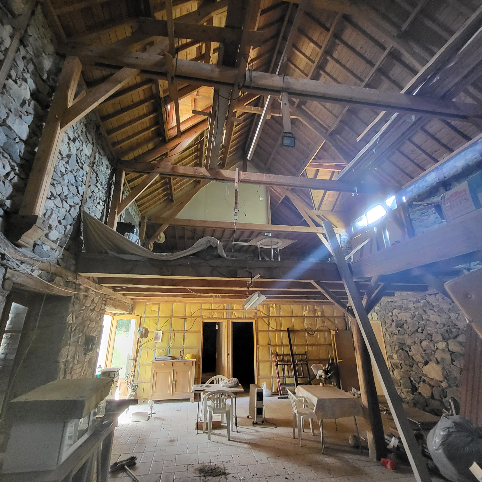 La maiosn est composée d'une grande piéce de vie avec plafond cathédrale avec grande cheminée en pierres,, 2 chambres, une salle de bain avec douche et baignoire, wc séparée, coin buanderie.
