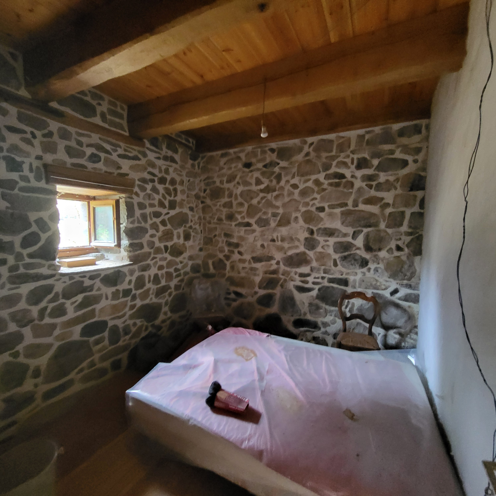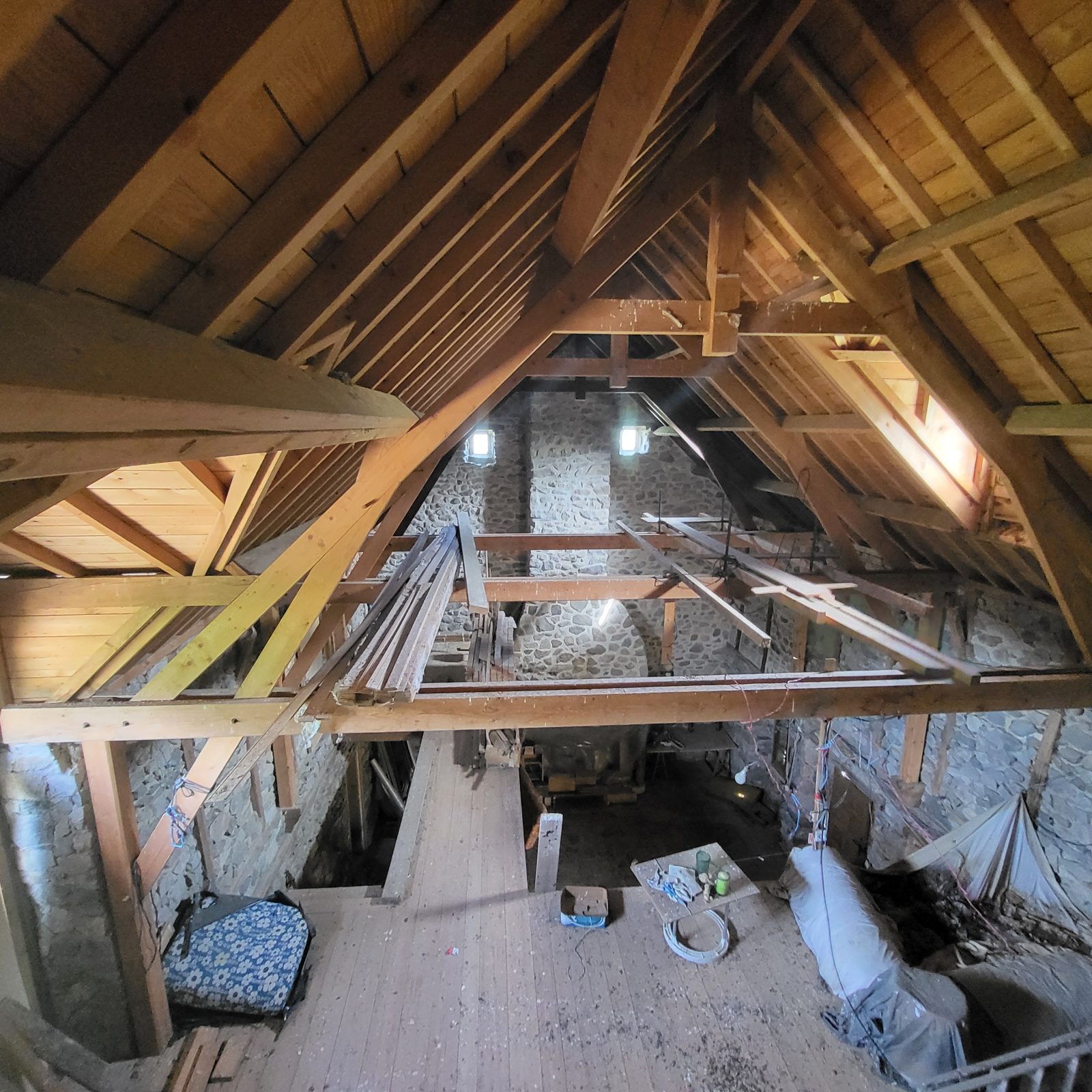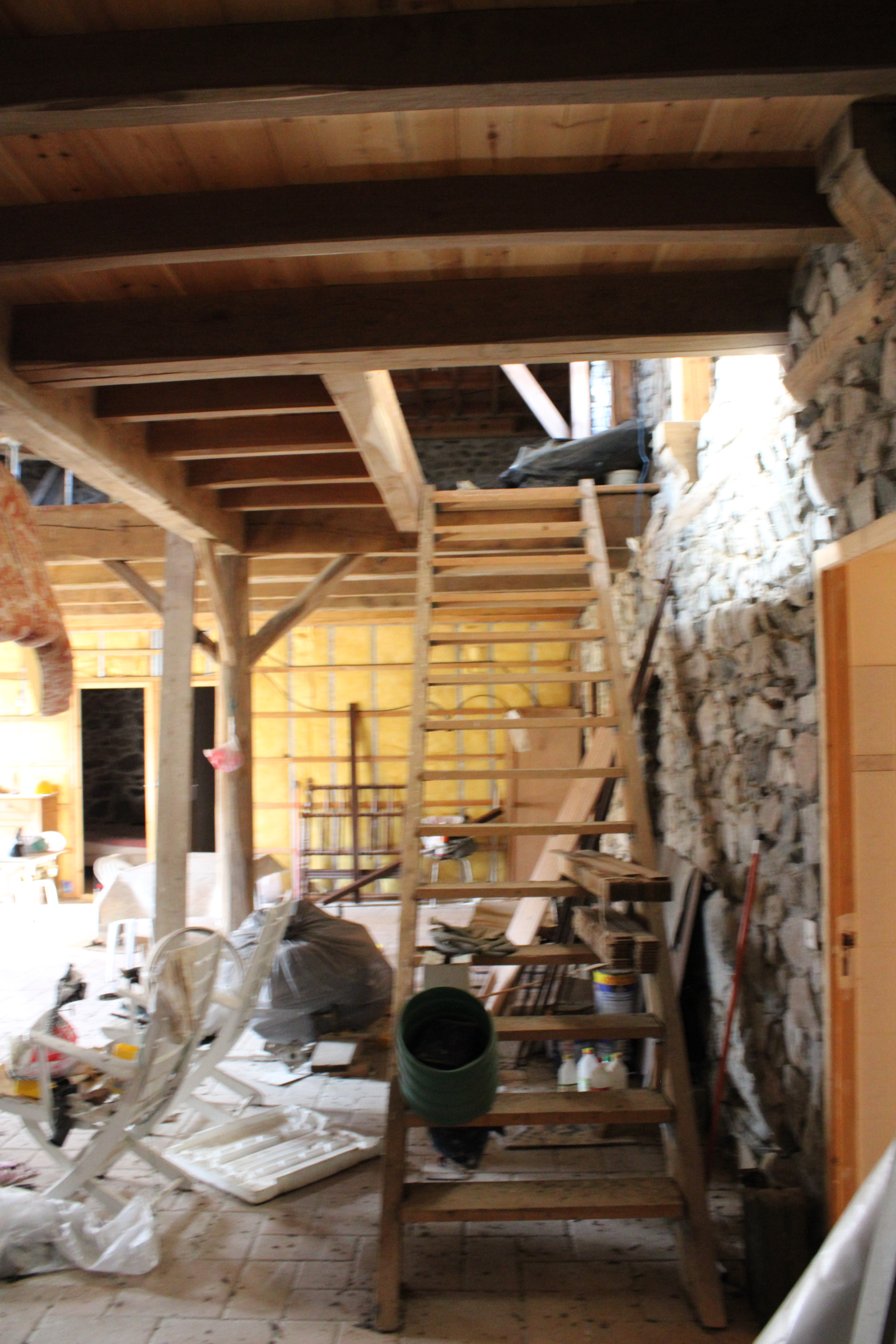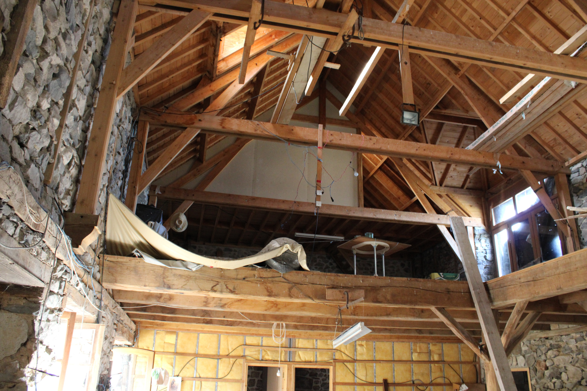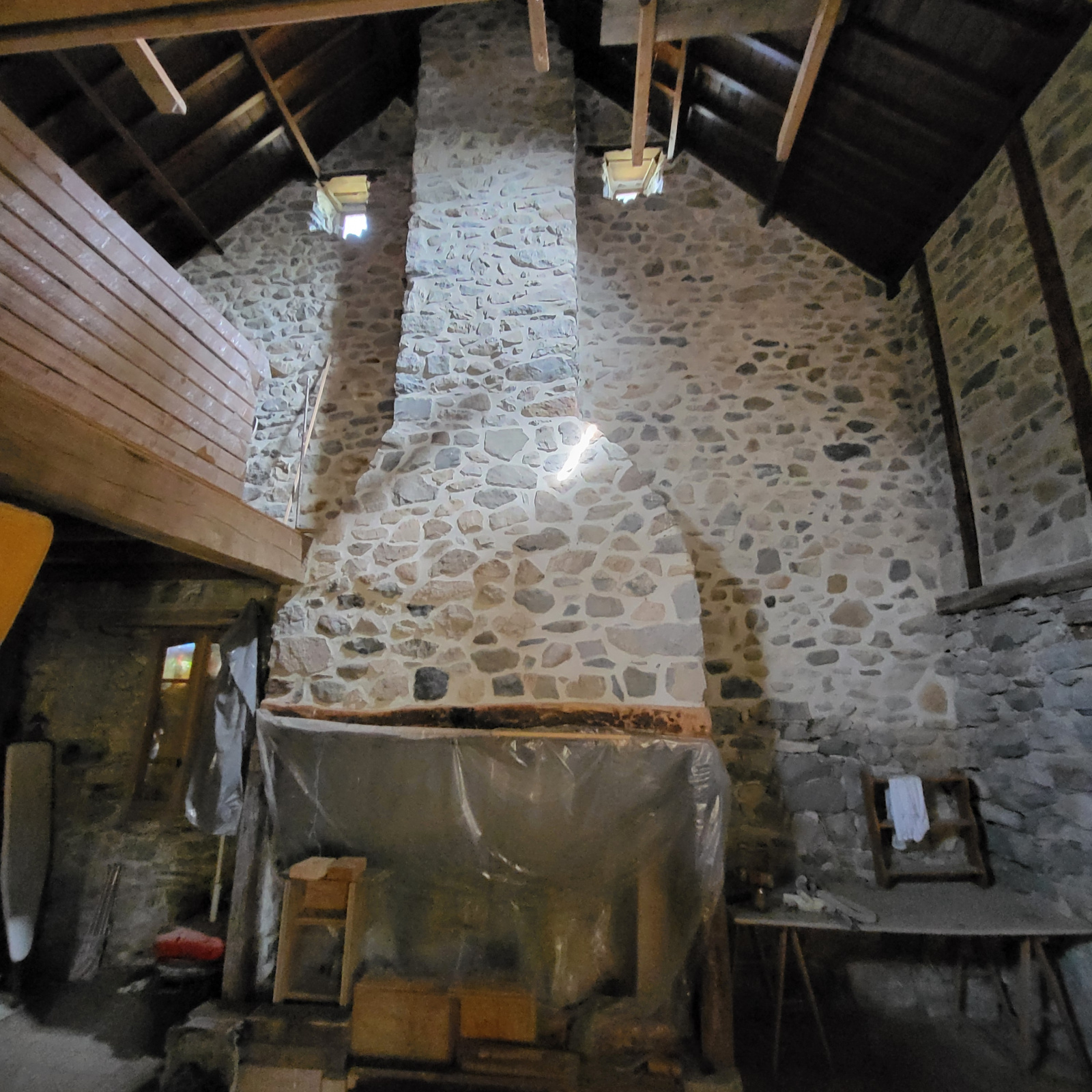 La maiosn est composée d'une grande piéce de vie avec plafond cathédrale avec grande cheminée en pierres,, 2 chambres, une salle de bain avec douche et baignoire, wc séparée, coin buanderie.