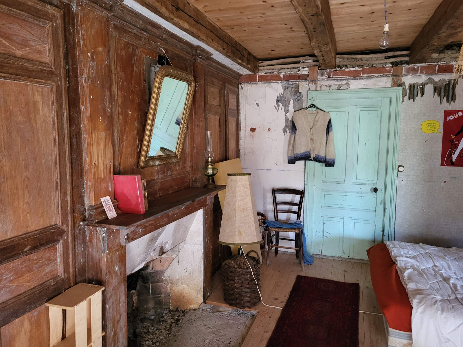 A l'étage, une chambre avec boiseries et cheminée, pièce pour une future salle de bain (arrivée d'eau) ,accés au comble aménageable.