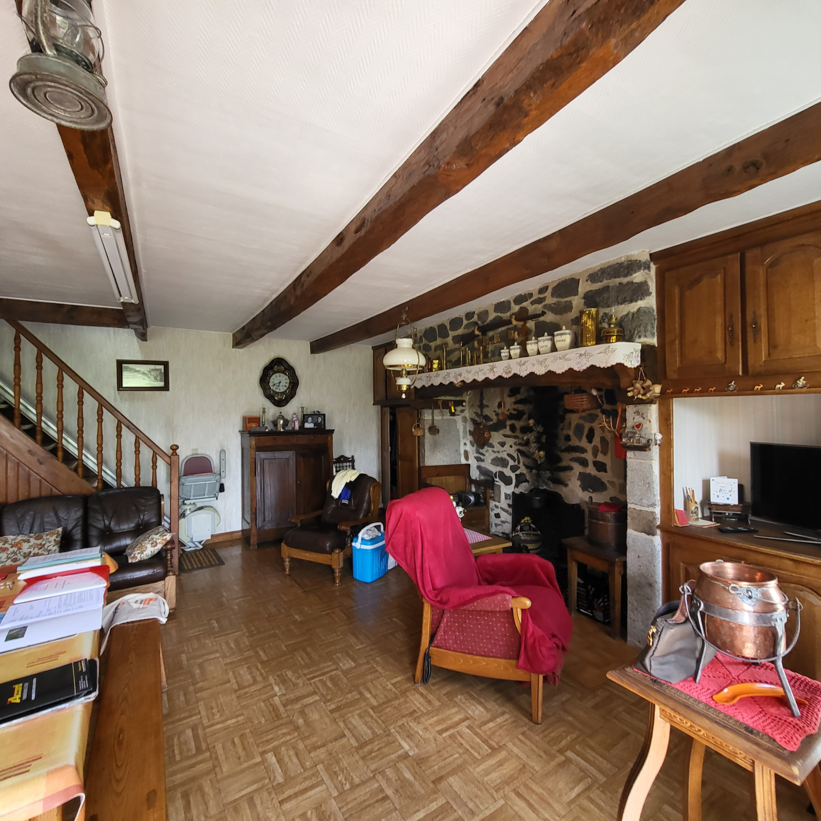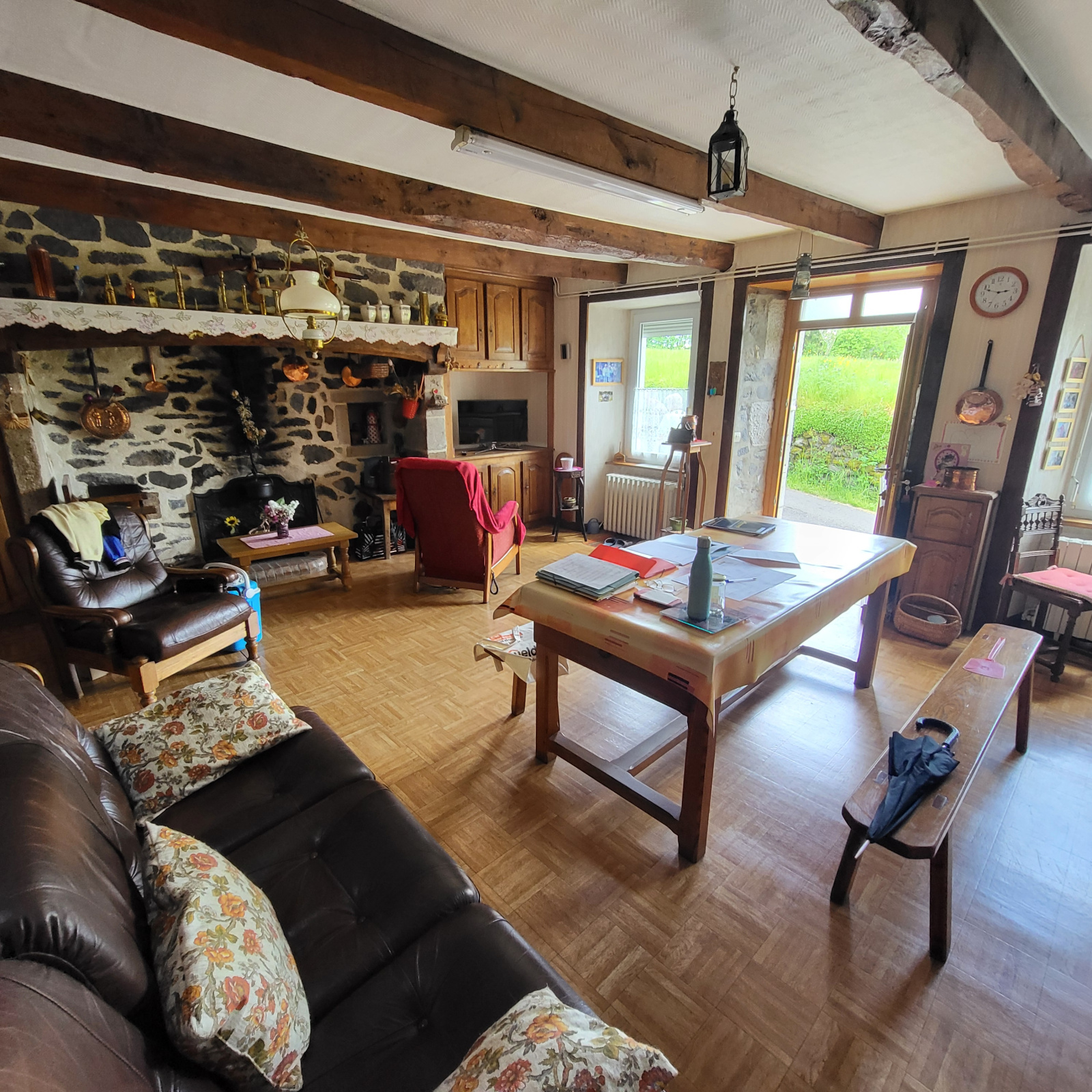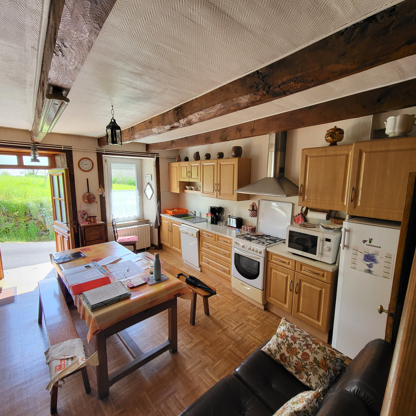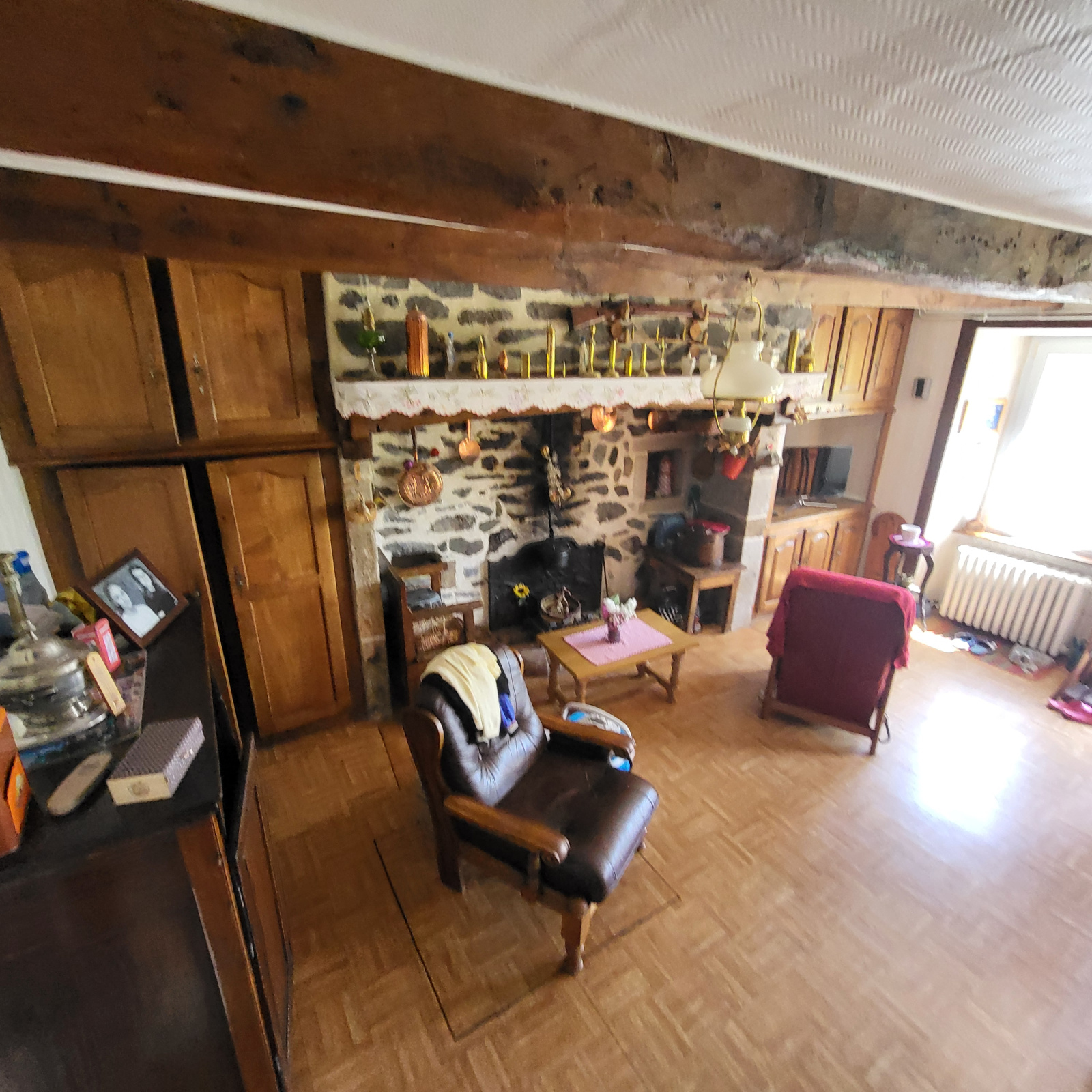 La première maison est composée au rez-de-chaussée d'une ancienne cuisine avec la chaudière dans le Cantou,
