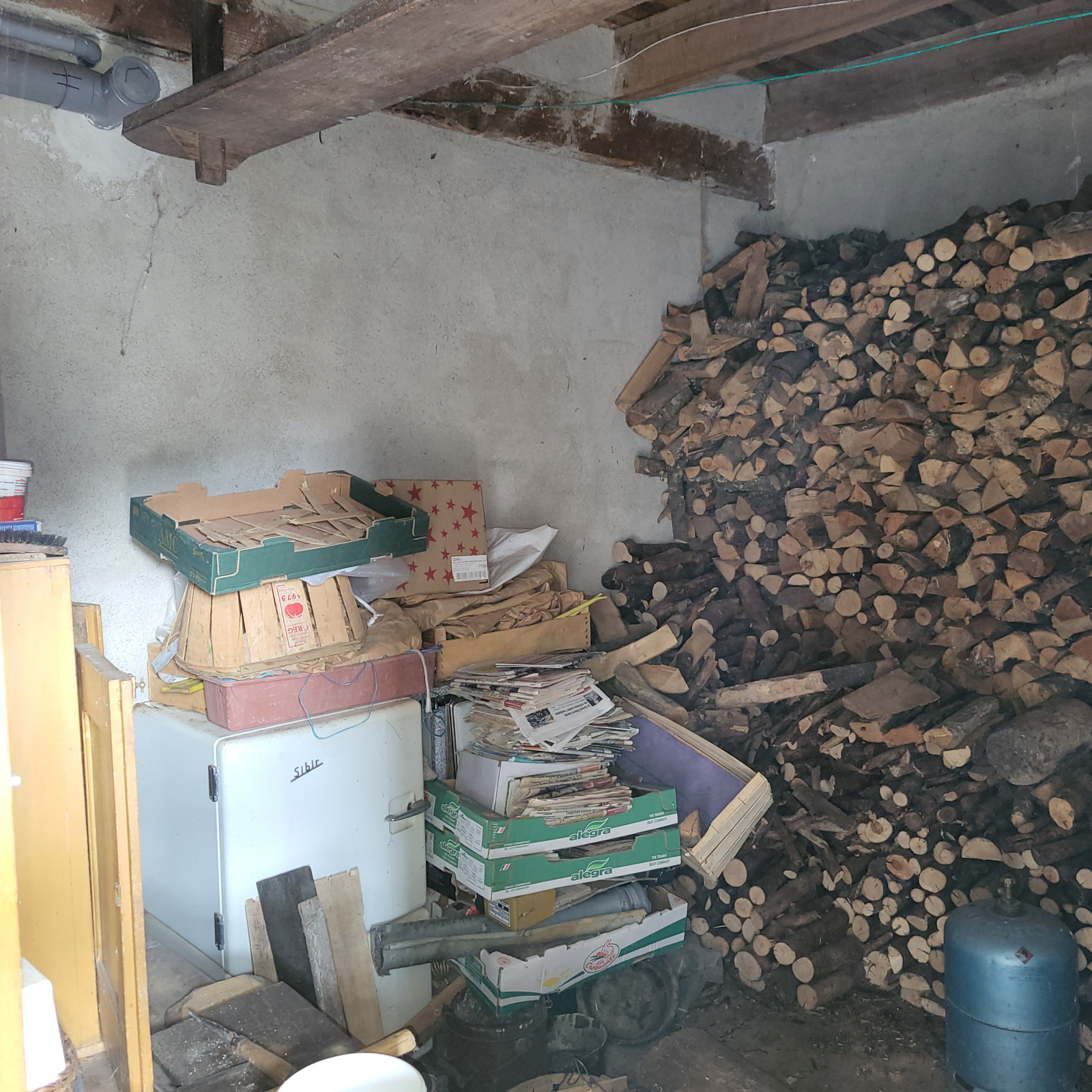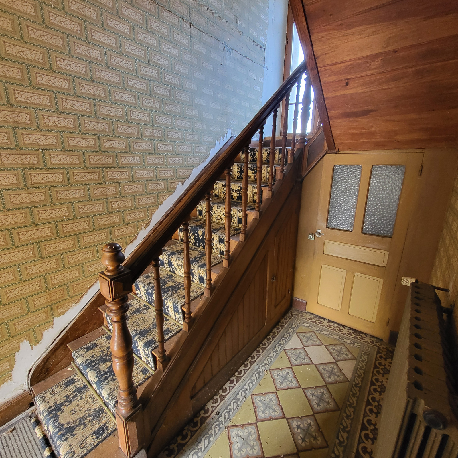 Elle est composée au rez-de-chaussée, d'une entrée avec carreaux de ciment, cave, garage,atelier, wc, cage d'escalier toute hauteur.
