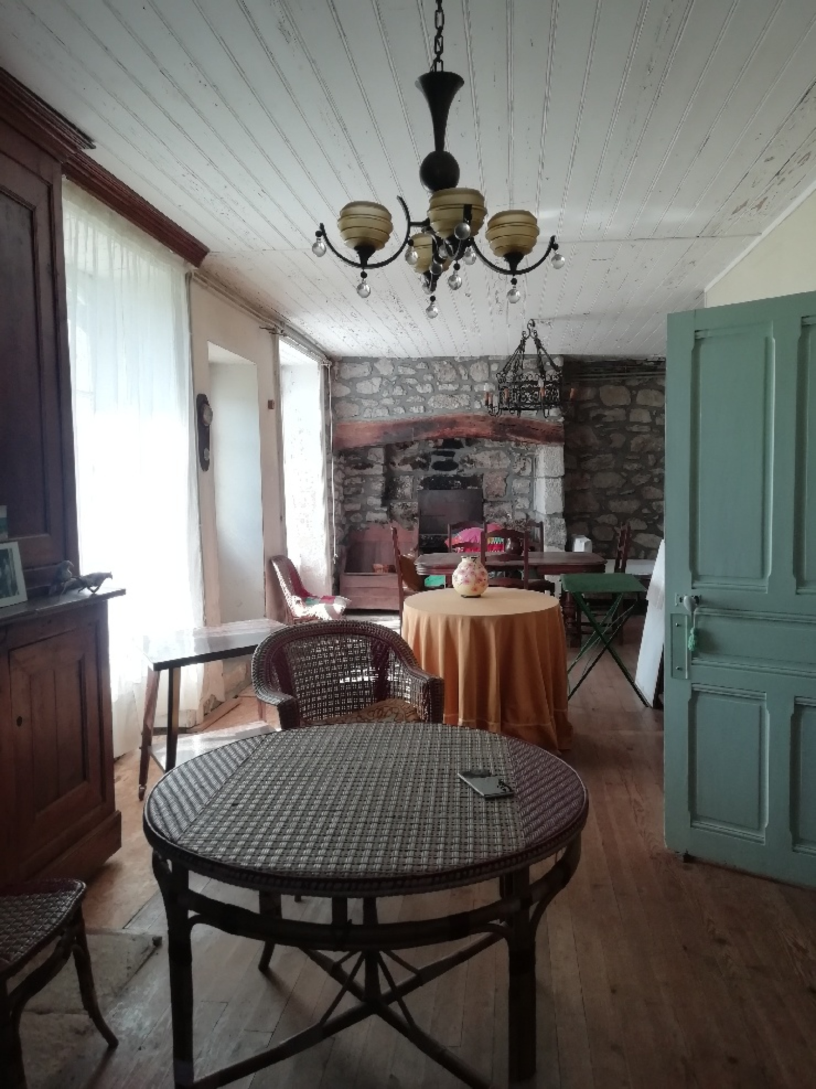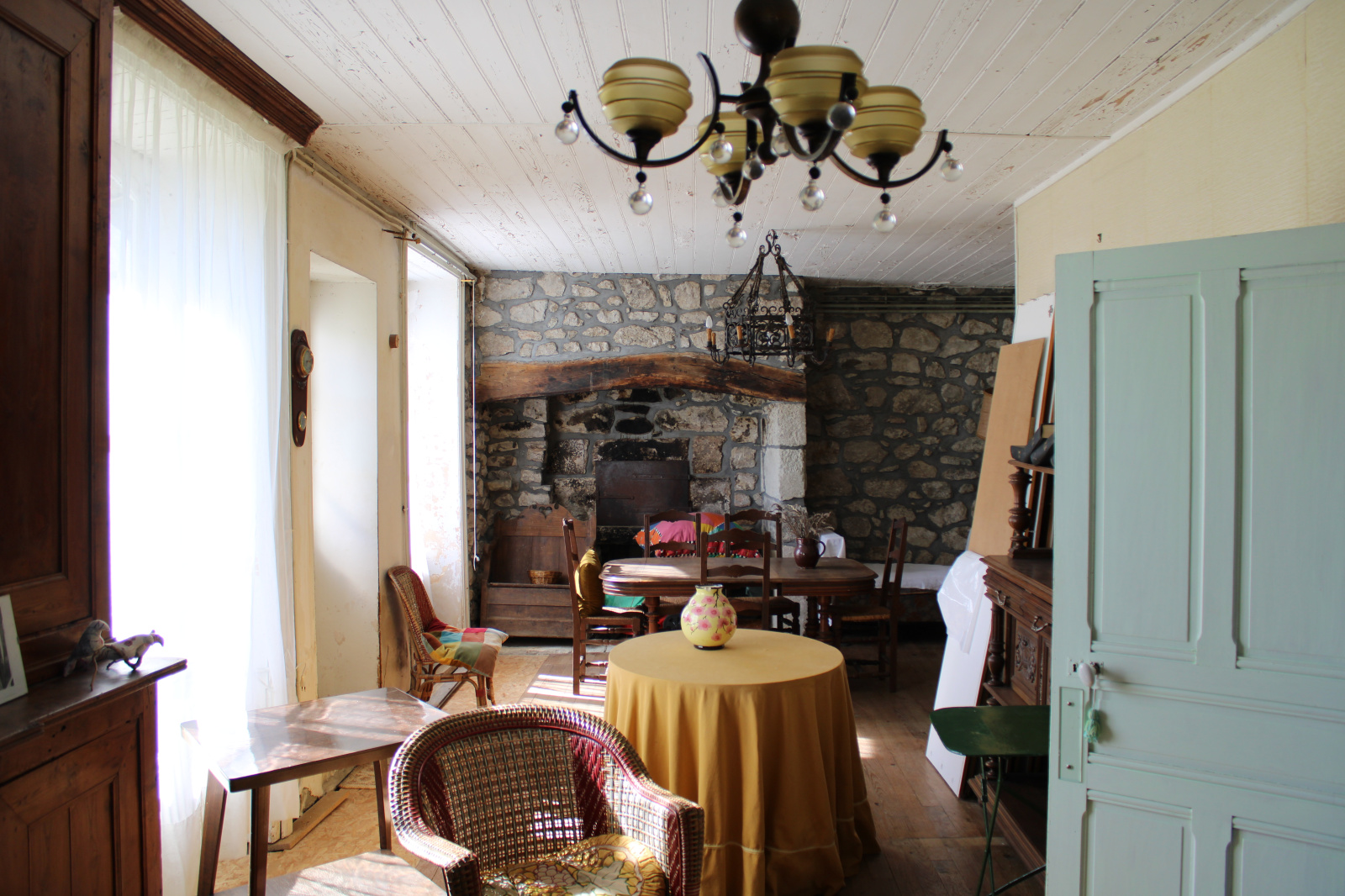 Au rez de chaussée, un salon/salle à manger avec cantou, pierres apparentes et boiseries, avec un accès sur le jardin, une cuisine fermée, une salle de bain avec wc.