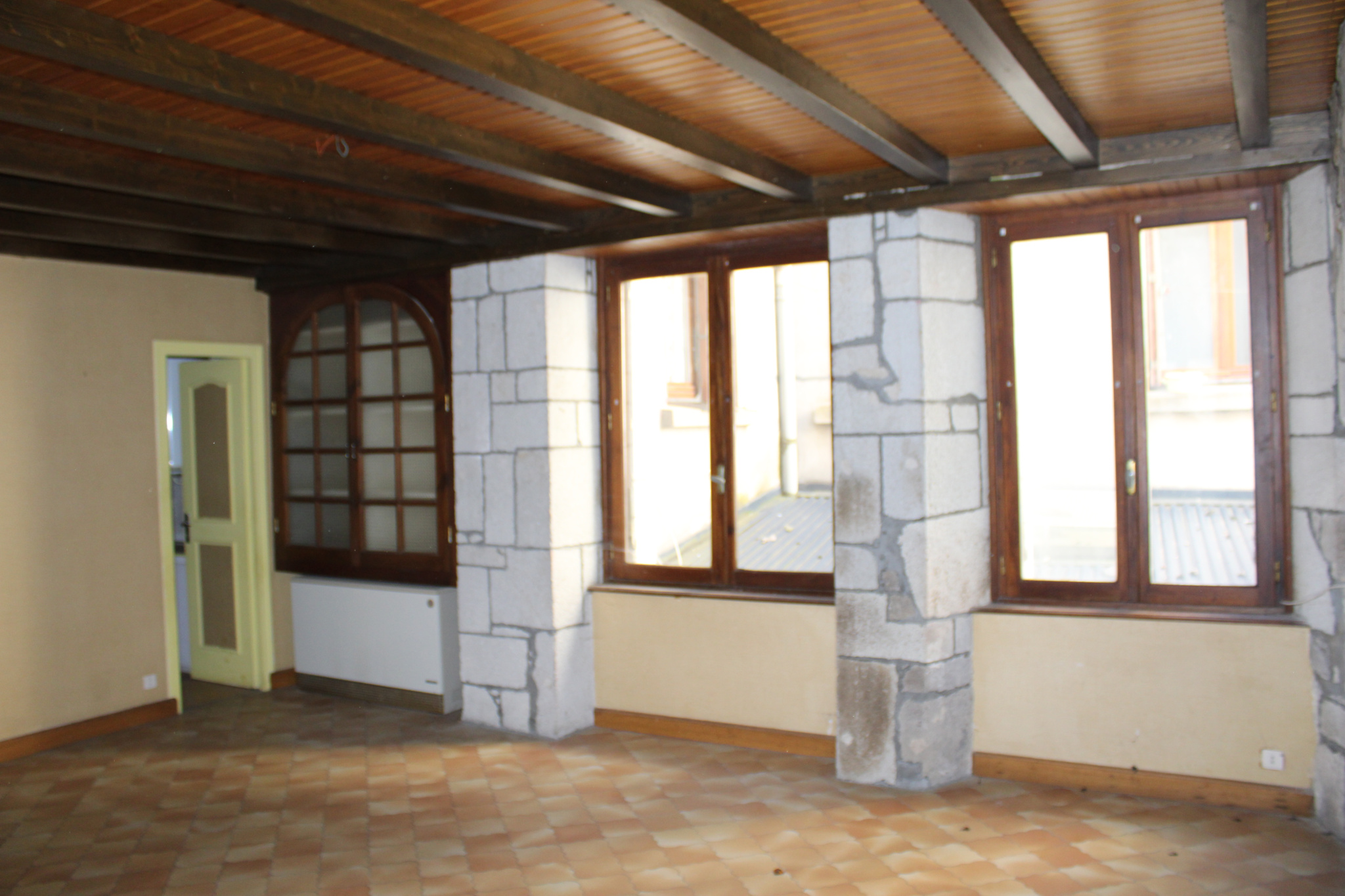 La deuxiéme partie : une cuisine, un grand séjour avec cheminée en pierres, une salle de bain avec wc et un sas.