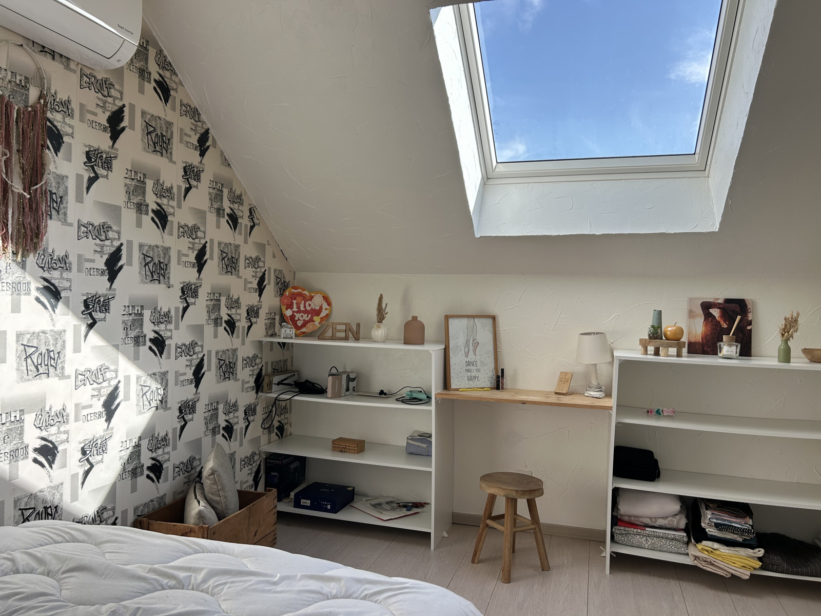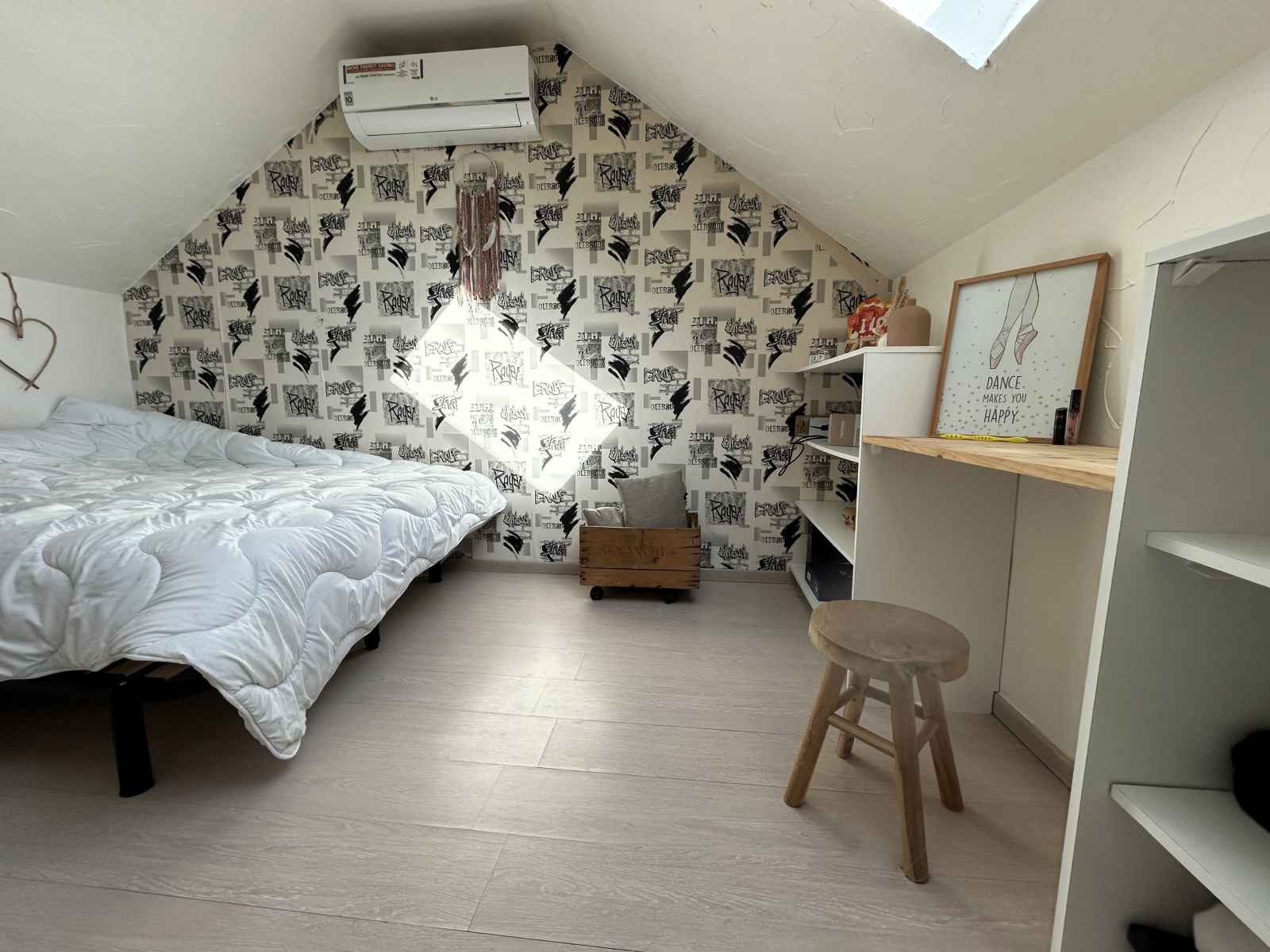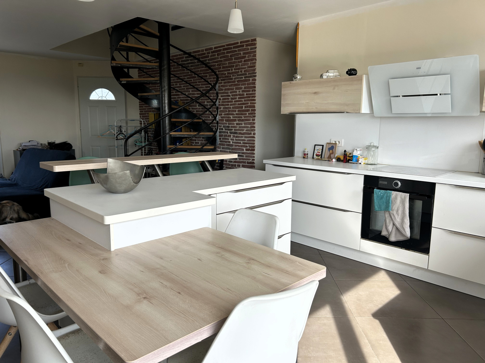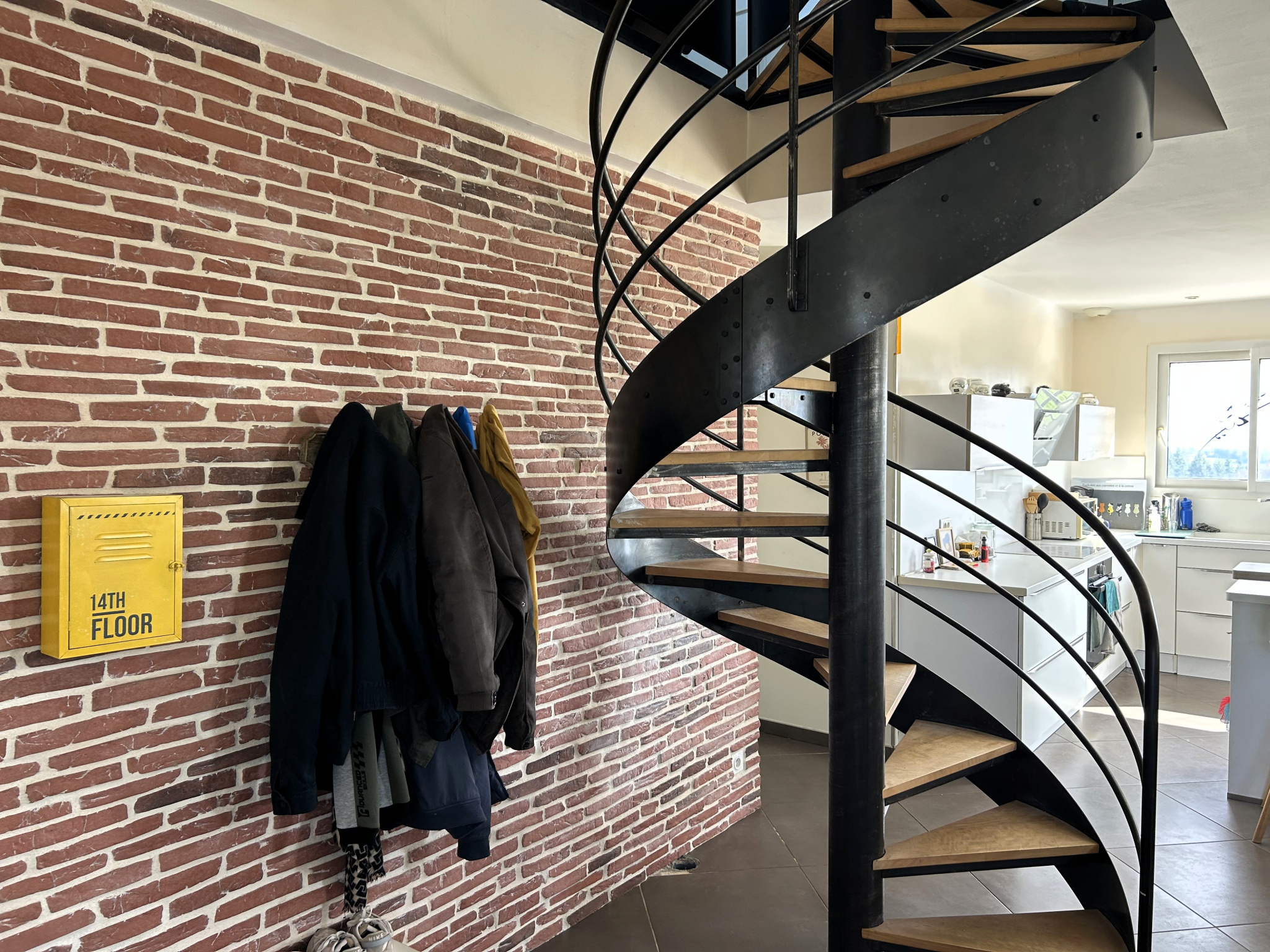 Pour monter à l'étage, vous emprunterez ce magnifique escalier en colimaçon dans son style industriel, qui vous amène à un palier ouvert permettant d'accéder à une autre chambre, ainsi qu'à un bureau, un espace de rangement et un autre WC indépendant.
