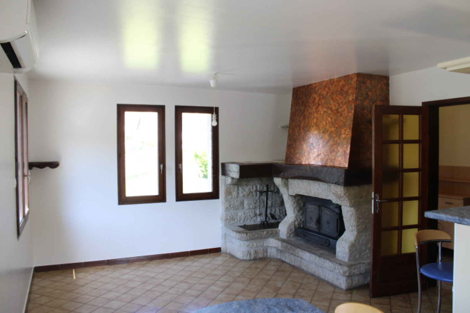 La maison est composée au rez-de-chausséee d'une entrée avec placards, belle piéce de vie , cuisine ouverte sur salon-salle à manger avec cheminée pierres.
